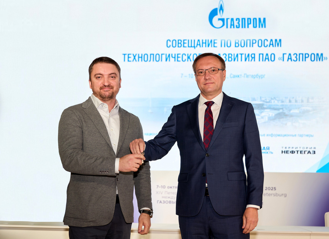 Символическое подписание Миллером А.Б. передачи экскаватора-планировщика УДС-4321-5 на газовом шасси в опытно-промышленную эксплуатацию Газпром ТрансГаз Ухта в рамках ПМГФ-2025.
